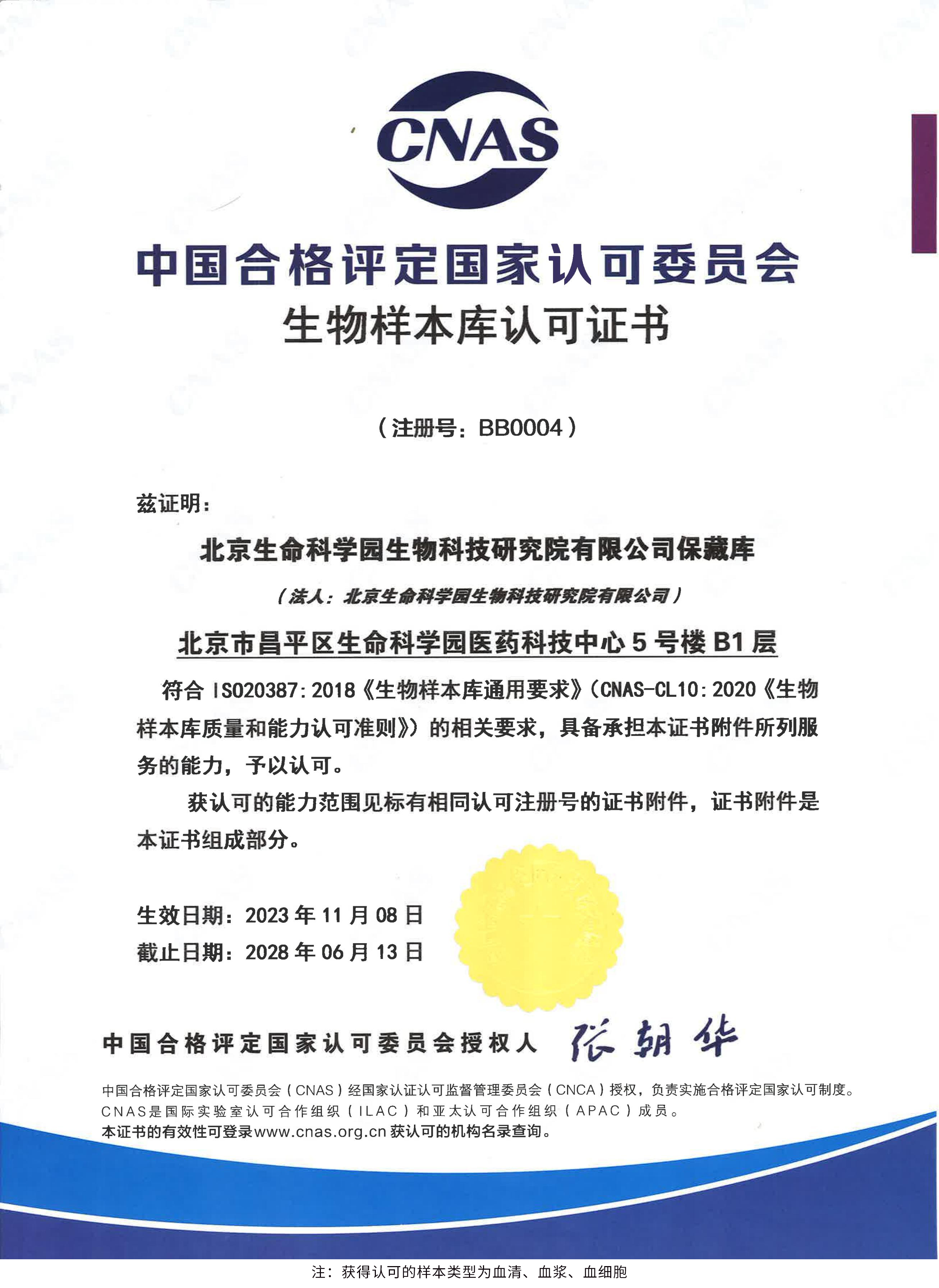 北京生命科學園生物科技研究院(以下簡稱“北京生物樣本資源庫”)(Biobank of Life Science Park,簡寫“BoLSP”)是一家由北京市科委和中關村生命科學園共同支持設立的第三方生物樣本庫公共服務平臺,秉承北京重大疾病臨床數(shù)據(jù)和樣本資源庫(以下簡稱“北京庫”)(Beijing Biobank of Clinical Resources,BBCR)十余年的發(fā)展成果,聚合眾多臨床樣本專家的專業(yè)共識,致力于在生命科學、生物醫(yī)藥研究領域發(fā)揮銜接樣本資源持有者與研究者的橋梁作用,解決生物樣本資源開發(fā)上下游信息不對稱、資源共享困難等問題。研究院在北京中關村生命科學園昌平園區(qū)建立了2000㎡生物樣本庫,最大存儲規(guī)模達1000萬份。研究院遵循CNAS-CL10:2020《生物樣本庫質量和能力認可準則》,同時結合北京庫過去十年的工作經驗與教訓,建立了一套完善的生物樣本保藏質量管理體系,從人、機、料、法、環(huán)、控多個角度,實現(xiàn)生物樣本保藏過程的全面質量控制,先后獲得國家科技部頒發(fā)的人類遺傳資源保藏行政許可證書和中國合格評定國家認可委員會(China National Accreditation Service for Conformity Assessment,CNAS)頒發(fā)的“CNAS認可證書”。
